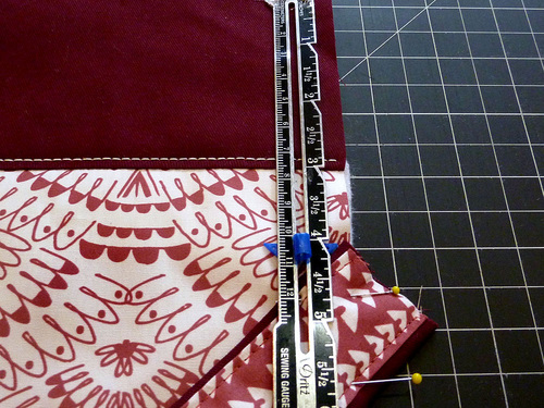 - Fold the flap right sides together along the original crease line, aligning all the raw edges. Pin along both sides.