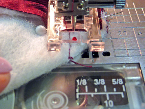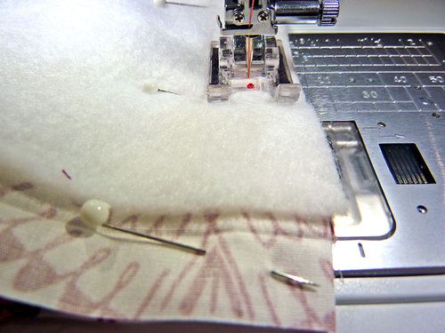 - Thread the machine with thread to best match the feature fabric in the top and thread to best match the base fabric in the bobbin. Lengthen your stitch.