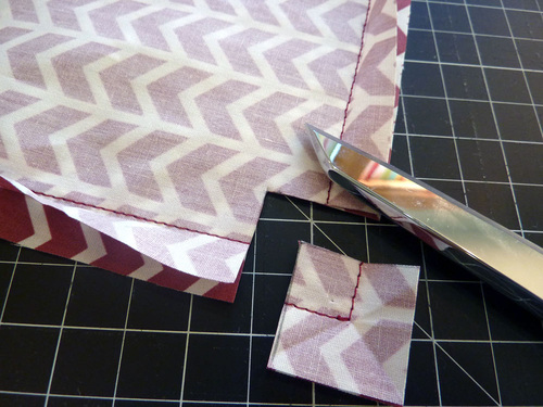 - Using a rotary cutter if possible (for better precision), slice along the center drawn line (through both layers), starting and stopping ½” from each end. Then use your scissors to clip from each end of the cut line diagonally up to each corner.