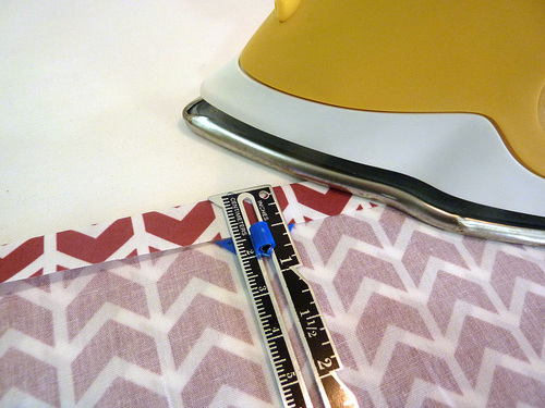 - Using the clear ruler and a fabric pen or pencil, measure 1½” down from the top folded edge and draw a 7″ horizontal line. This line should be centered side to side (1½” from each side edge) and parallel with the top folded edge.