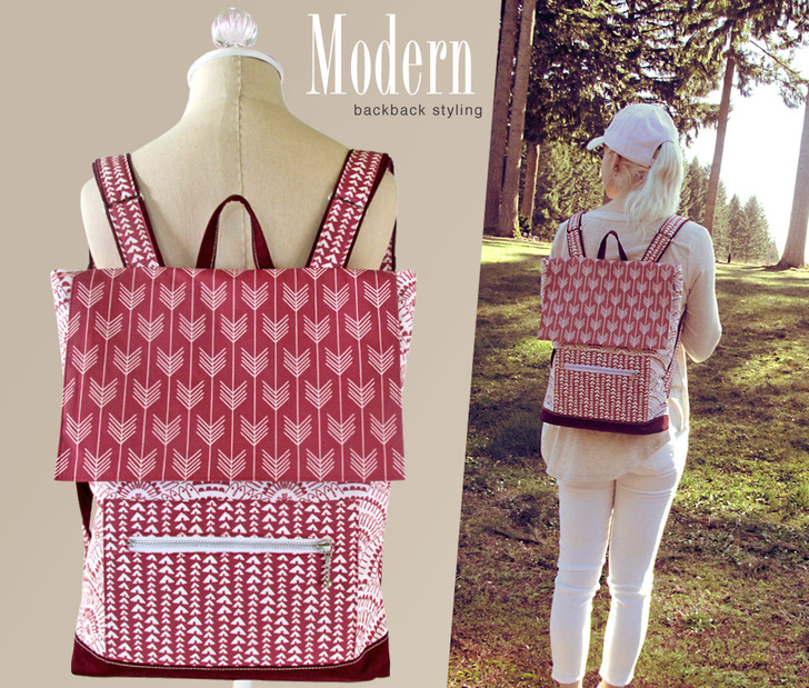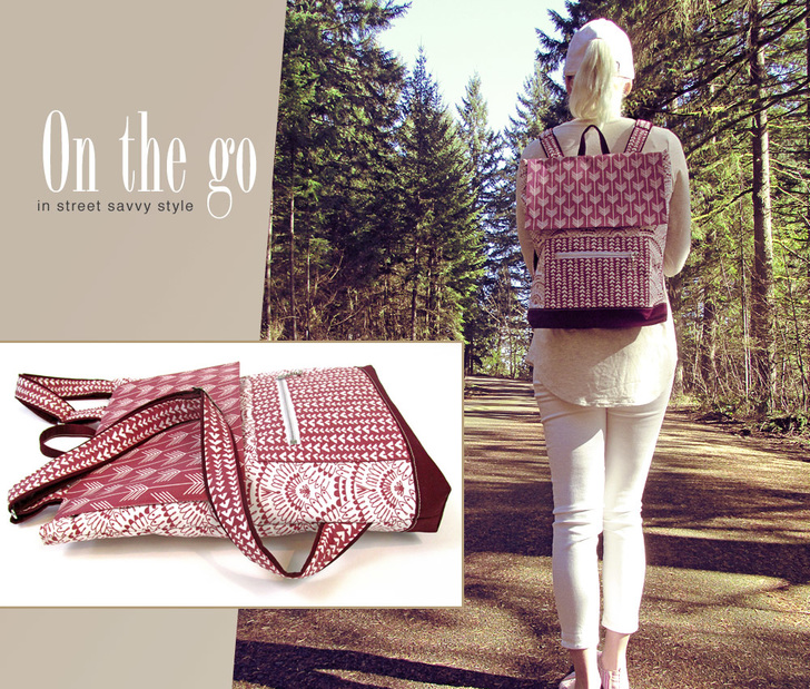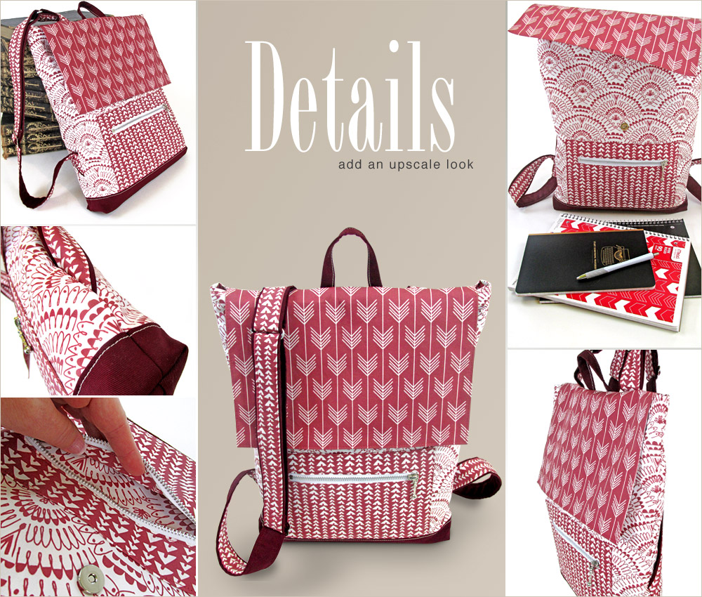 We employed a variety of stabilizers: fleece for the body, firm interfacing for the flap, and low loft batting for the padded straps. The result is a lightweight yet sturdy pack.