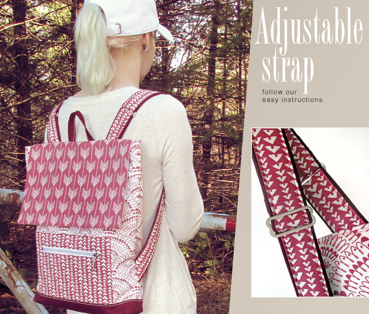 Adjustable straps allow you to find just the right fit against your back for the load you’re carrying. We show you all the steps below to get the threading correct through all the the rings and sliders. It’s easier than you might think, and it’s a technique you can use on so many bag and tote projects.