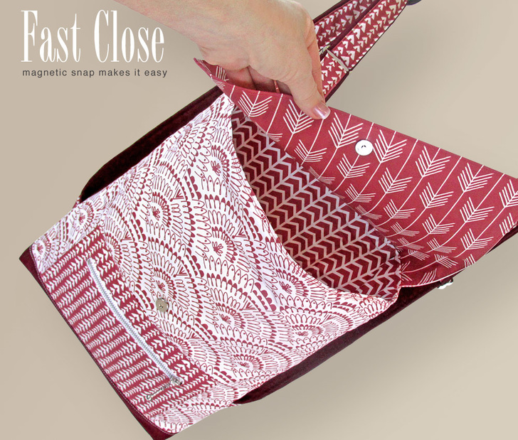 NOTE: We fussy cut our strap fabric vertically to create the proper look for this motif. If you use a different fabric that can be cut horizontally, you could get away with ½ yard. Or you could cut a number of shorter strips and seam them together to create the full 45″ length. - ½ yard of 45″+ wide twill weight fabric or similar for the bag base, straps and hanging loop; we originally used a classic burgundy