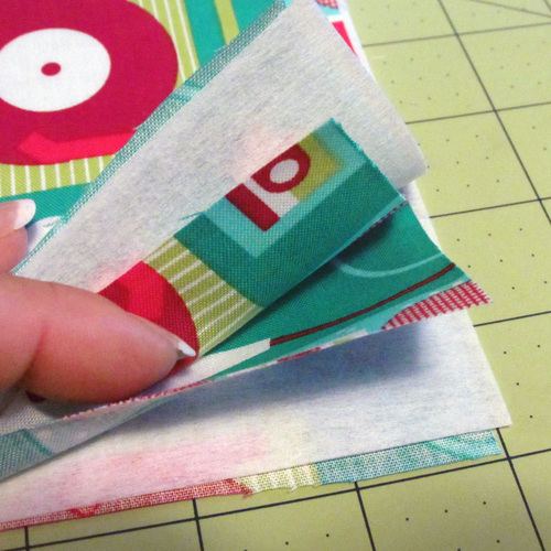 - Separate the stack back into two pocket sandwiches. Following the manufacturer’s instruction, fuse the interfacing to the wrong side of one fabric panel in each sandwich then re-layer as two pocket pairs, wrong sides together.