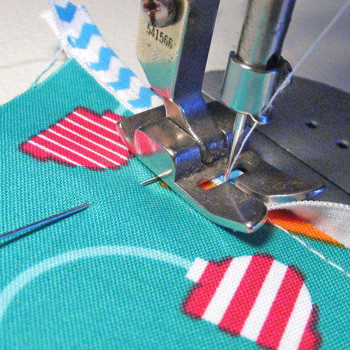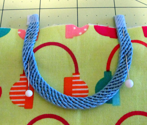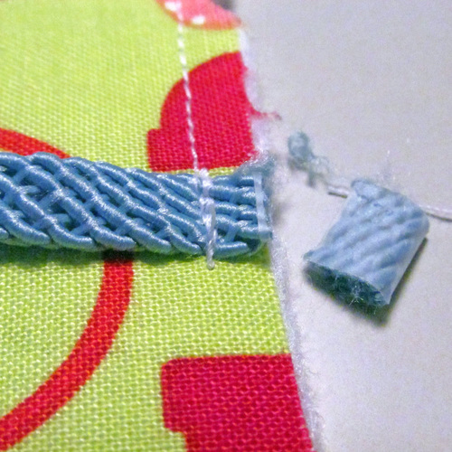 - Stitch across the loop ends to secure, running this short seam approximately ¼” from the raw edge. Trim away the taped ends so the cord lays flush against the fabric.