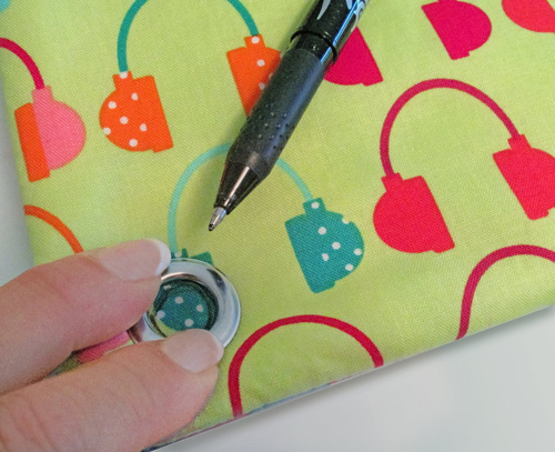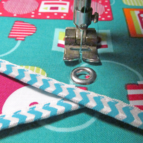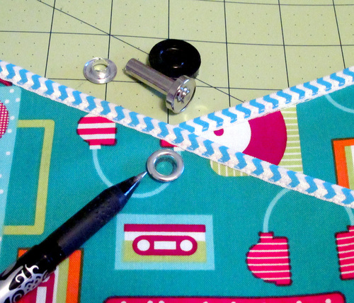 - Flip over one pair so the diagonal cuts are now mirror images of one another. Layer the two pockets one on top of the other, aligning the bottom and side edges. Mark and set the one smaller eyelet at the intersection where the pockets cross. The eyelet should be set down just far enough to clear the binding. If you are new to working with eyelets/grommets, check out our full step-by-step tutorial: How To Install Metal Grommets (don’t let the name fool you; an eyelet is simply a small grommet).
