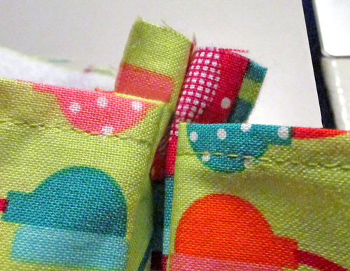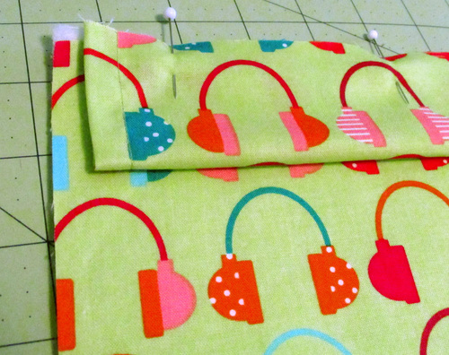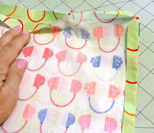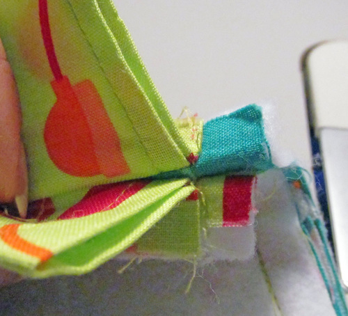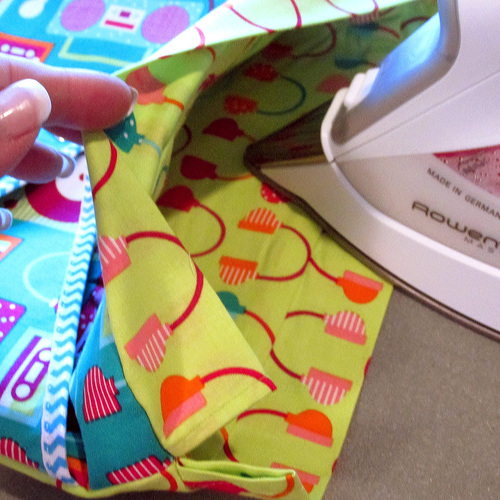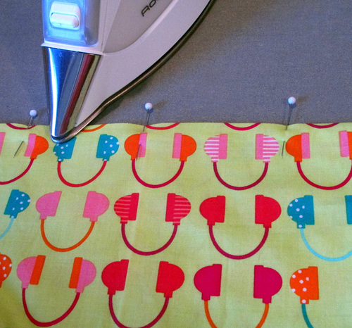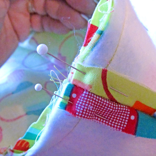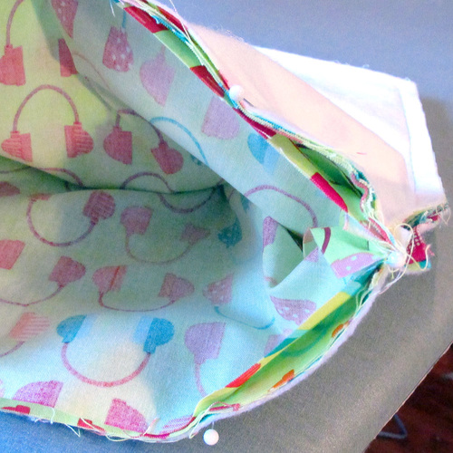 - With the lining still pulled out, press in the raw edges of the bottom opening so they are flush with sewn seam and pin in place.