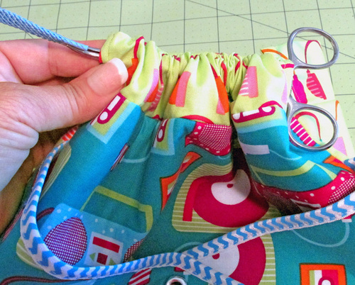- Thread the cording through the top casings of the bag. Go from right to left through the front casing, then from left to right through the back casing.