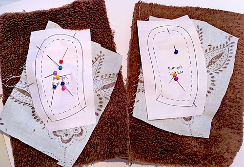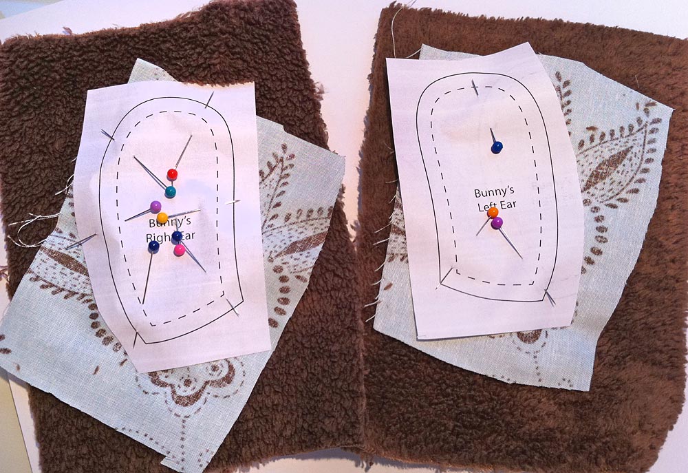 - Cut out the two ear pattern pieces. Place one piece of fleece and one piece of cotton fabric, each slightly larger than the ear pattern piece, right sides together. Pin the pattern piece to the layers. We pinned on the cotton side so we could to fussy cut my ear patterns over an appropriate motif on the fabric. Repeat for the second ear.
