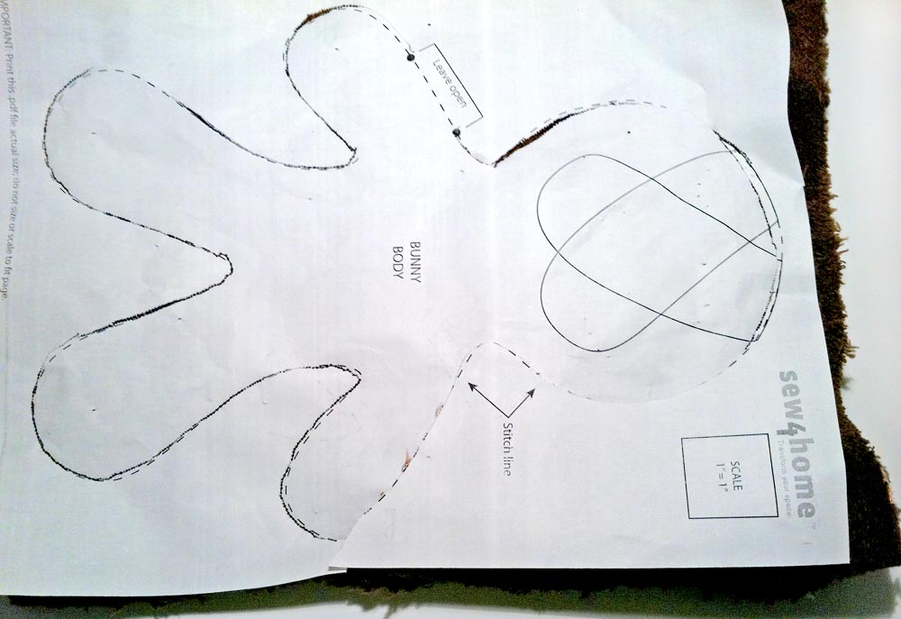 - Place the Bunny Body printout on top the wrong side of one of the 8½” x 11″ pieces of fleece. Anchor with a few straight pins.