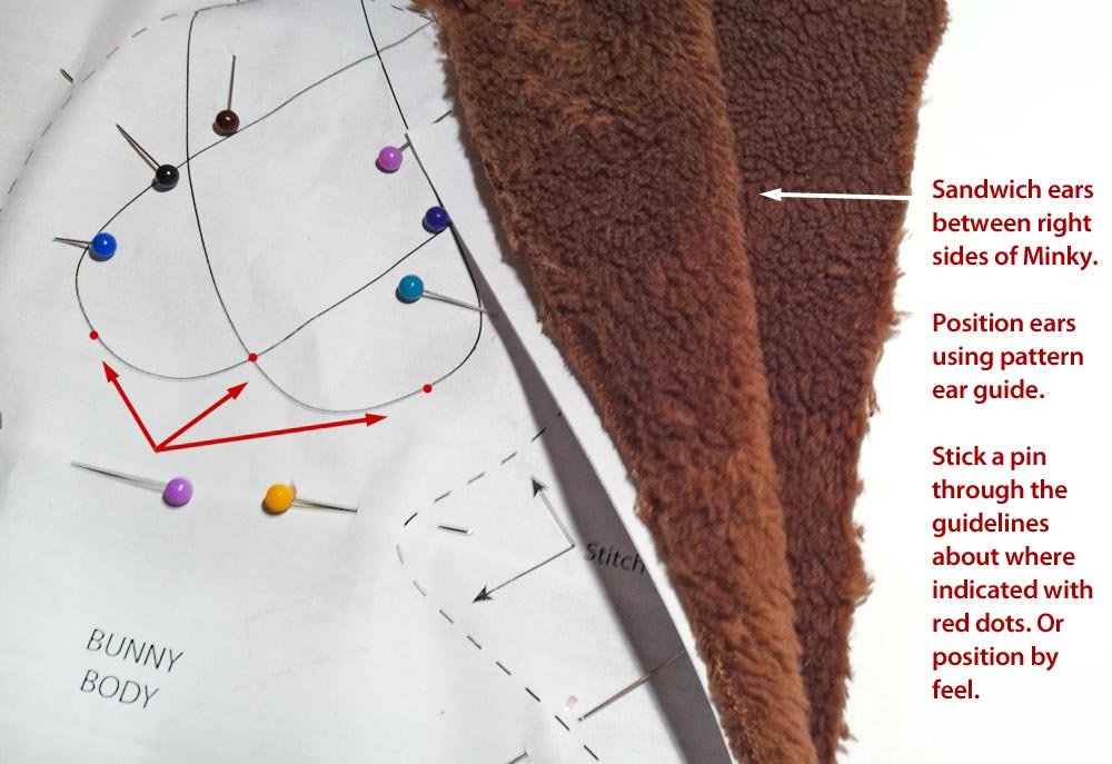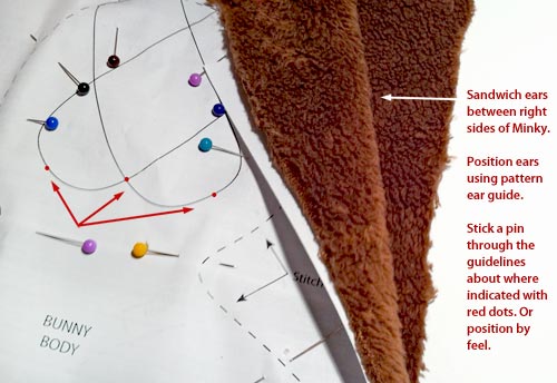 NOTE: The ears go beneath the fleece, NOT between the pattern and the fleece. - Use the pins to find the corners of the ears and pin the ears in position underneath the fleece.