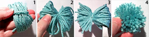 - Wrap yarn around your fingers as shown photo 1. Cut a piece of yarn to tie in the center and slip between ring and middle fingers.