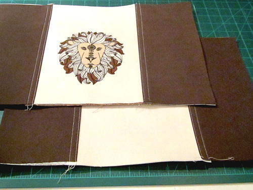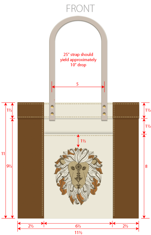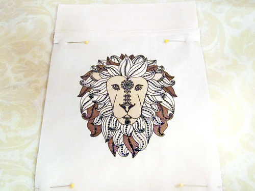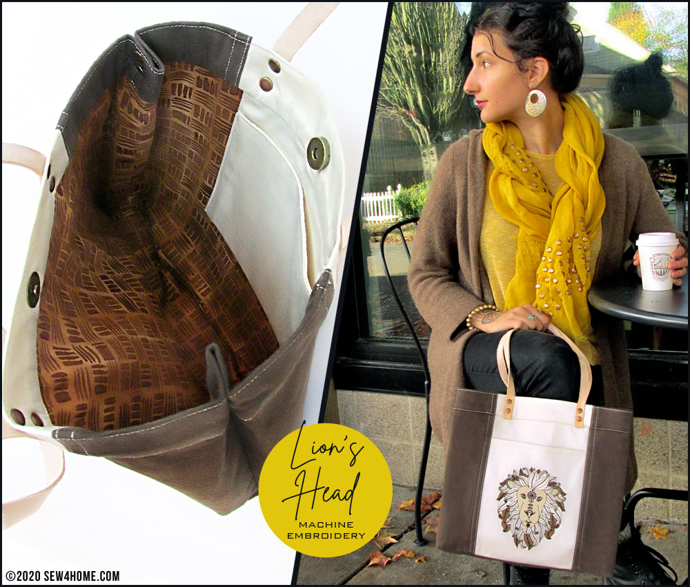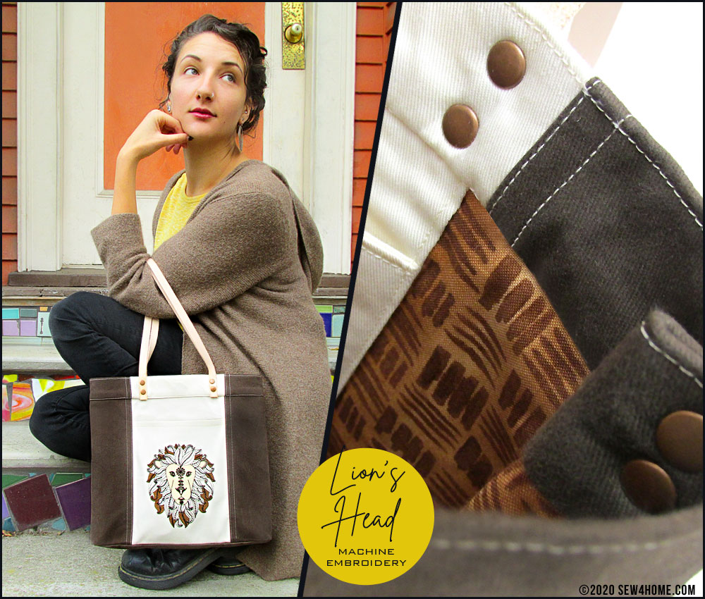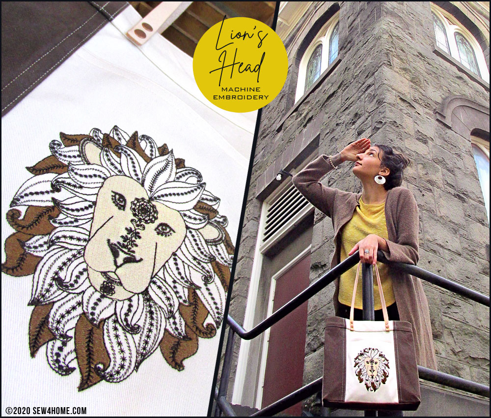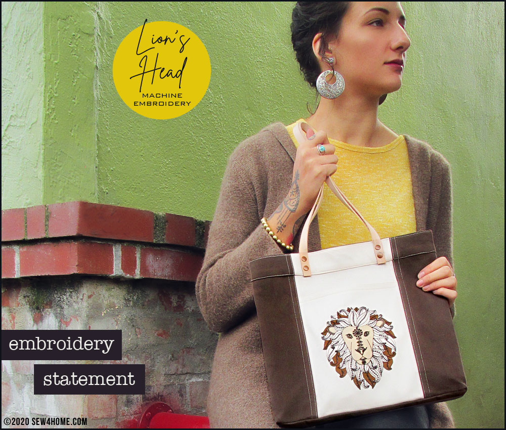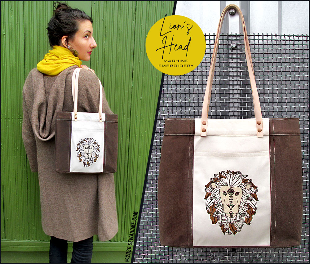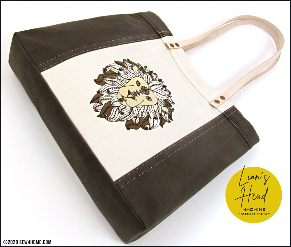 We stitched the design on the front pocket of our handsome mini tote that would be great as an everyday handbag. We kept the selected fabrics in coordinating neutrals to focus all the attention on the embroidery. Even with just three colors, the detail in our Lion’s face and mane is impressive.