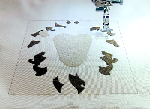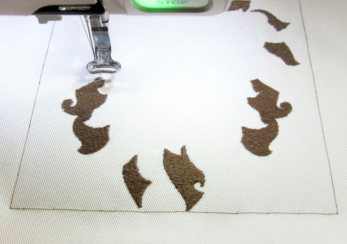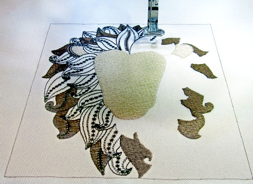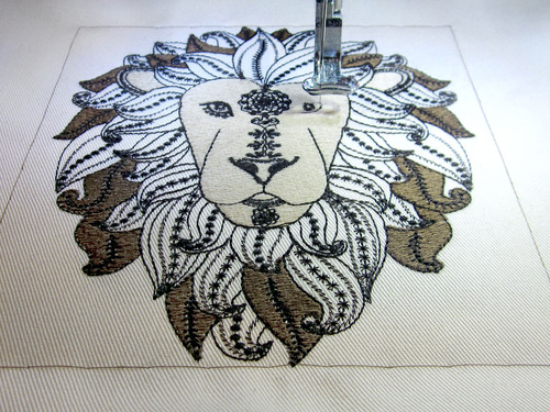 - Replace the hoop and embroider the second color, the lion’s face and ears.