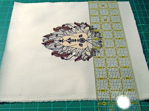 - Place your ruler vertically along the exact center of the embroidery. Slide the ruler and embroidery along your cutting line so the ruler aligns with a vertical grid line on the mat.