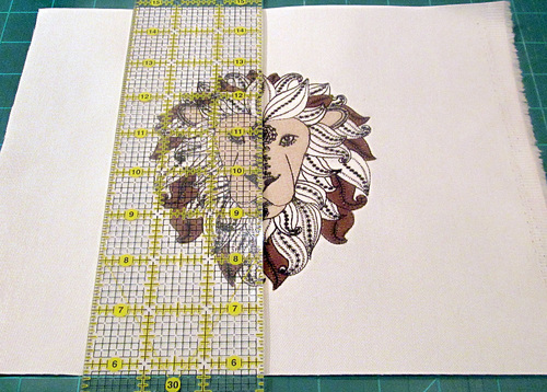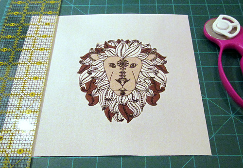 - Download the Lion’s Head embroidery design in the appropriate format for your machine. Save the design to a memory stick. You should also print the PDF file with the design cross hairs for placement.