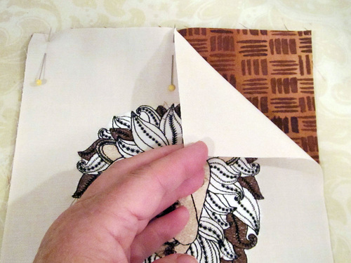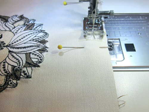 - Place the pocket panel lining and the embroidered pocket panel right sides together. Our embroidery is so precise, it’s hard to see in the photo below that we have the wrong side of the design facing up, but it really is – your exterior and lining should be right sides together. Pin along the top only.