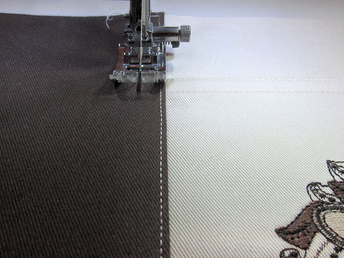 - Along both vertical seams, topstitch ⅛” from the seam within the side panel and then stitch again ⅜” from the first line of stitching.