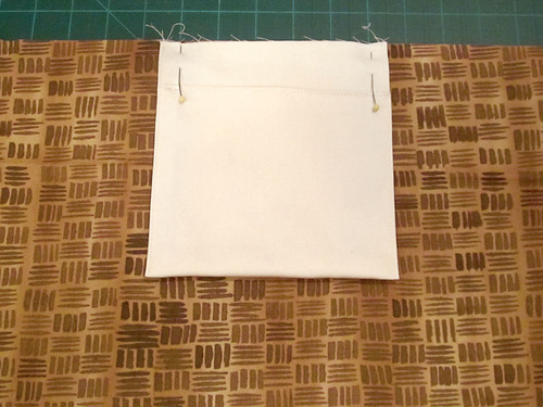 - Find one of the 7½” x 10½” center panels. Place it right side up on your work surface. Place the pocket, also right side up, over the center panel, aligning the raw side edges and the raw bottom edges. Pin in place.