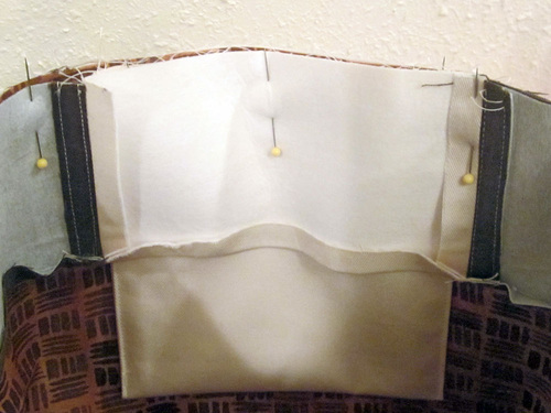 - Place the band inside the bag so the right side of the band is against the right side of the lining. The folded edge is facing down toward the bottom and the upper raw edge of the band is aligned with the upper raw edges of the bag. Match the seams of the band with the seams/colors of the exterior bag and pin in place all around.