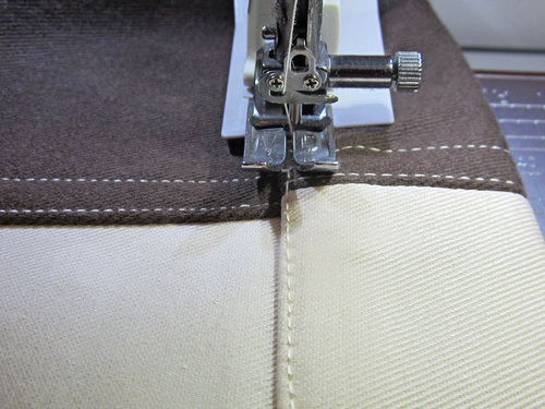 - Within the darker sections, create two lines of topstitching to match the topstitching on the body of the bag: ⅛” from the seam and then ⅜” from the first line of stitching.