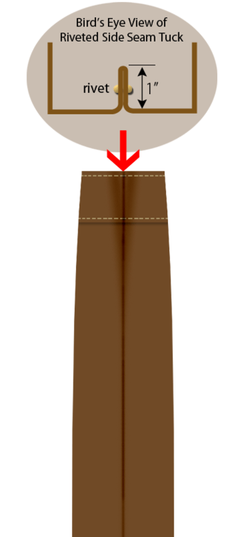- The finishing touch is to make a 1” inside tuck at each side seam. Secure the tuck with one or two rivets. We used two.