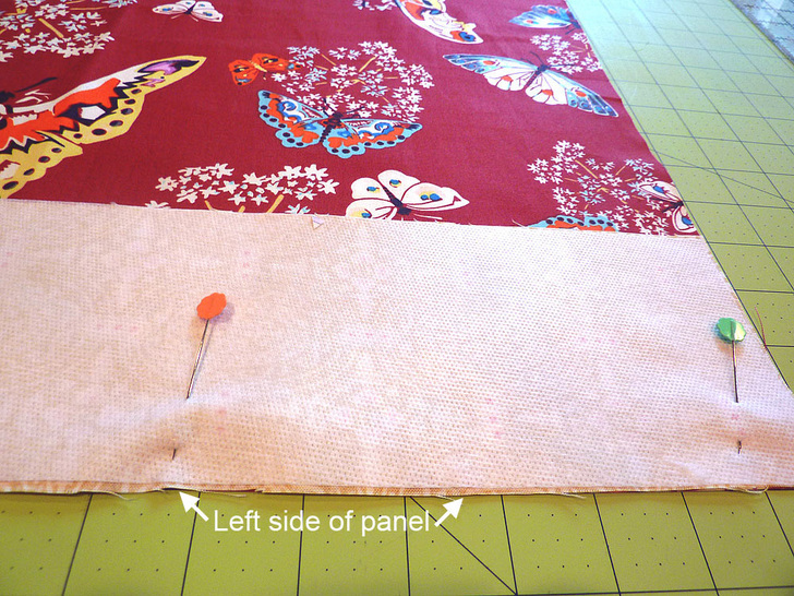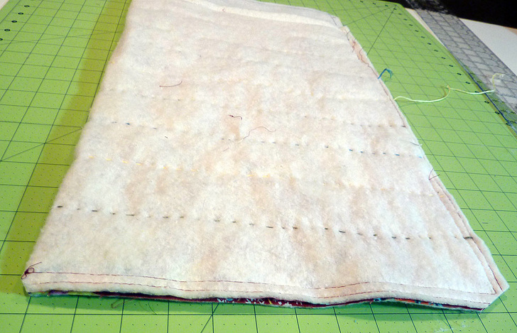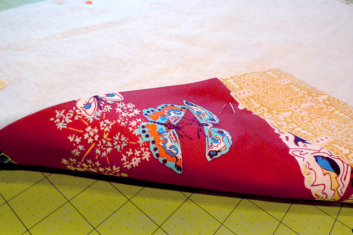 - Pin the batting to the wrong side of the main fabric panel. Both layers should be flush all around.