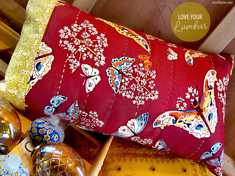 We love sewing by machine! It’s fast, it’s easy, and when you have great machines like the Janome models in our S4H studios, it’s almost effortless. But it doesn’t mean you can’t whip out the hand needle and thread now and then. A few well-placed hand-stitched accents add a unique decorative touch. Today’s lovely lumbar pillow features rows of simple running stitches in three coordinating colors of embroidery floss.