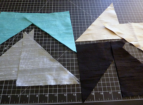 Using the layout and grain directional drawings above as your key, and Triangle #1 as your pattern, cut the following from the four colors of silk dupioni. Label your groups with their letters to insure you can remember which is which so all the grain matches up. A small piece of low-tack tape works well.
