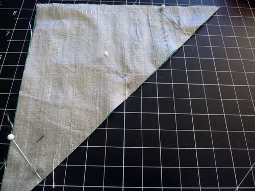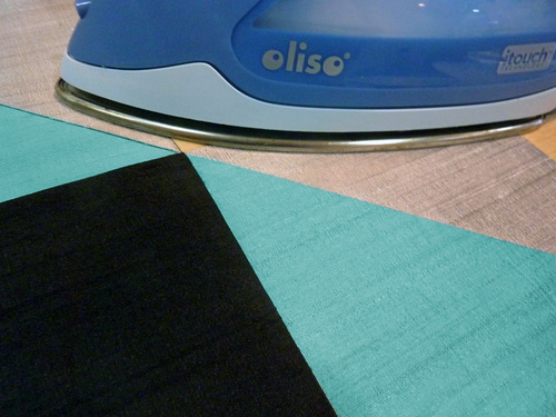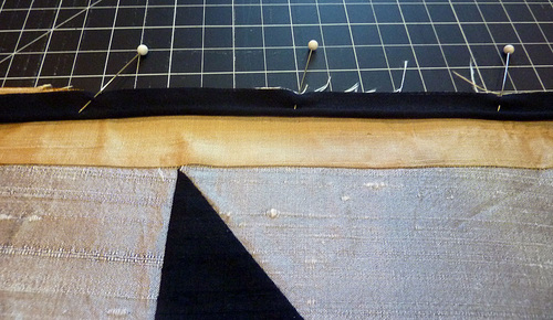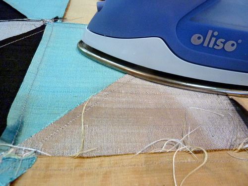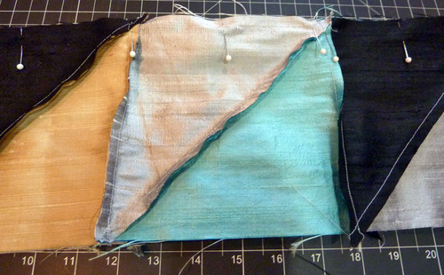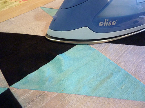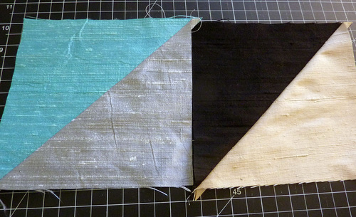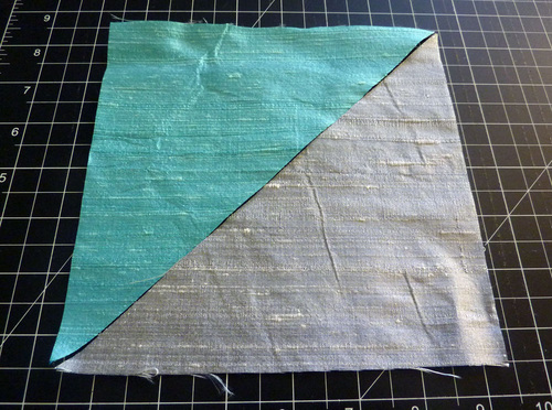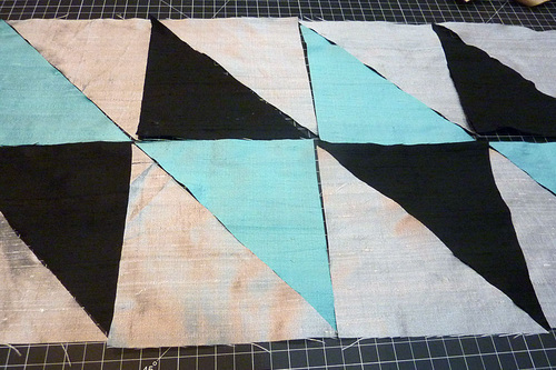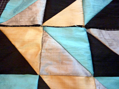 We also show you very specific assembly diagrams as well as a key for how to cut each triangle color with the proper grain direction. This is extremely important. The beautiful texture of the silk dupioni gives it a very distinct grain; if your triangles are not carefully cut, you’ll end up with the grain going every which way, destroying the pretty look.