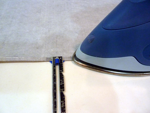 - On the fused overlap panel (15″ x 18½”), along the inside 18½” edge, make a 3¼” hem. To do this. Fold back the raw edge ¼” and press.