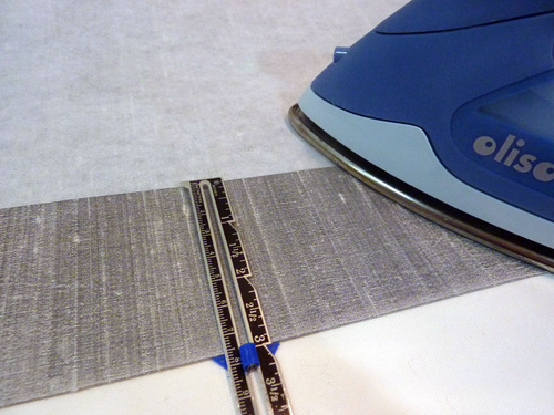 Silk dupioni is sturdy and substantial; it feels almost like taffeta. It’s very easy to sew with and holds a crease well. However, it does not stretch at all – so make sure your cuts are straight and true. We provide pattern downloads for our triangles to insure the best patchwork precision.