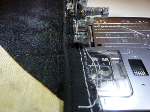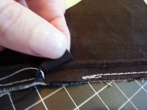 - Across the very top and the very bottom, make a small seam just across the overlap. Stitch as close to the raw edges as possible. These short seams simply anchor the two pieces together, allowing you to work with the back as one piece rather than two when finishing the front-to-back seam.
