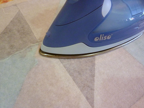 - Find the 18″ x 18″ piece of lightweight fusible interfacing. Following manufacturer’s instructions, fuse it to the back of the completed pillow top. This interfacing layer helps keeps all the patchwork seams flat, giving the pillow top a nice, smooth finish. It also helps trap all the loose threads. Silk dupioni has a tendency to ravel; by using the interfacing you can stop the fraying without having the finish each and every little seam.