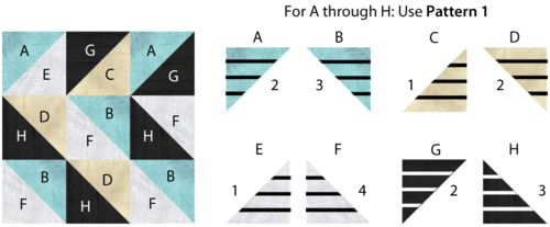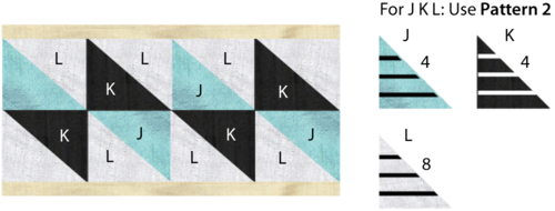 - Assemble your squares and rows in the same manner. Layout your two rows of triangles in order, matching the key above. The accent strips go top and bottom