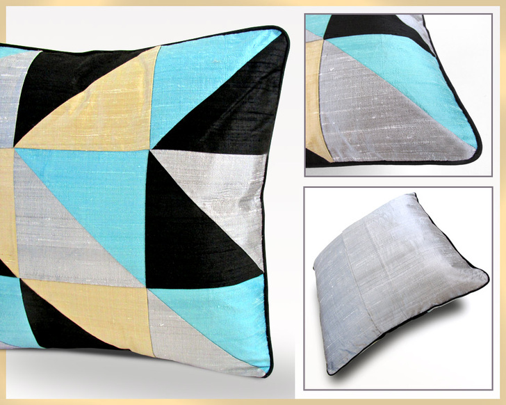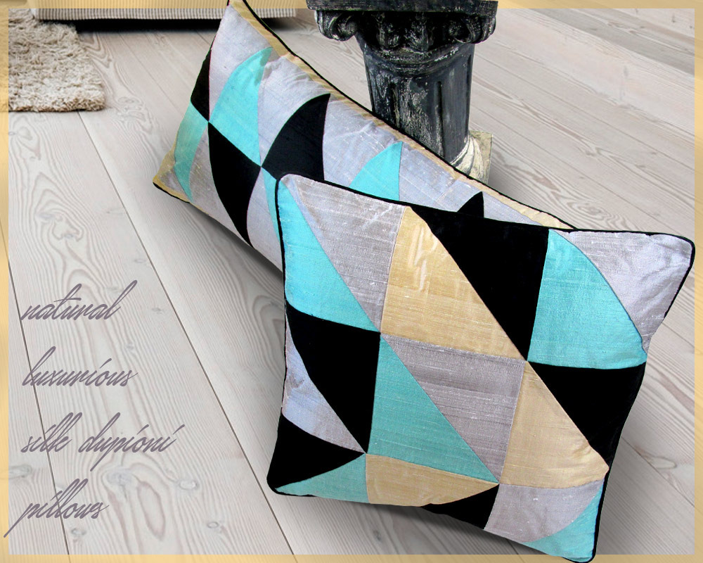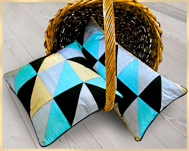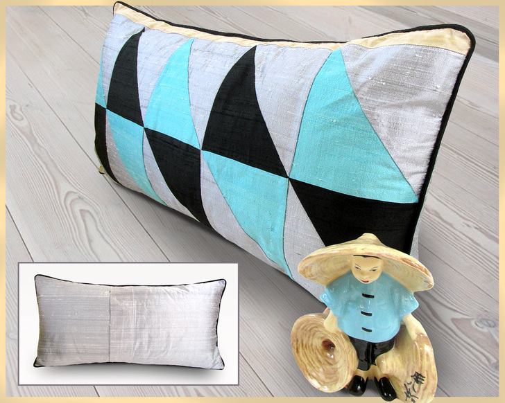 When you think of patchwork, you traditionally think of quilting cottons. But there’s no rule saying you have to use cotton. In fact, if you’re a regular Sew4Home visitor, you know we love to experiment with different fabric substrates. Today, we’re adding luxury into the mix with silk dupioni. This type of silk is made from twin cocoons naturally bonded together. The bumps in the fabric, they’re really called ‘slubs’, are the result of this bonding. Dupioni is often woven from two different colors of thread, giving it a shimmering, color-shifting appearance. We chose a jewel-box color blend of Tiffany blue, glittering silver, burnished gold, and rich ebony. Our pillows work together as a pair, and our supply list is structured to allow you to buy the correct amount of fabric to make both.