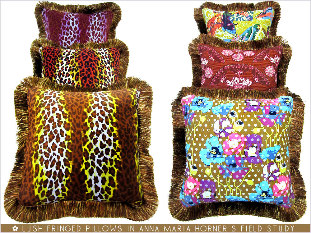 We call this our favorite “flora and fauna” set. The lush and plush pillows feature botanicals on one side, animal prints on the other. We originally used one of Anna Maria Horner’s most color-packed collections: 2012’s Field Study for FreeSpirit fabrics. Although no longer readily available, you really can never go wrong when browsing Anna Maria’s fabric for decorator pillow ideas!