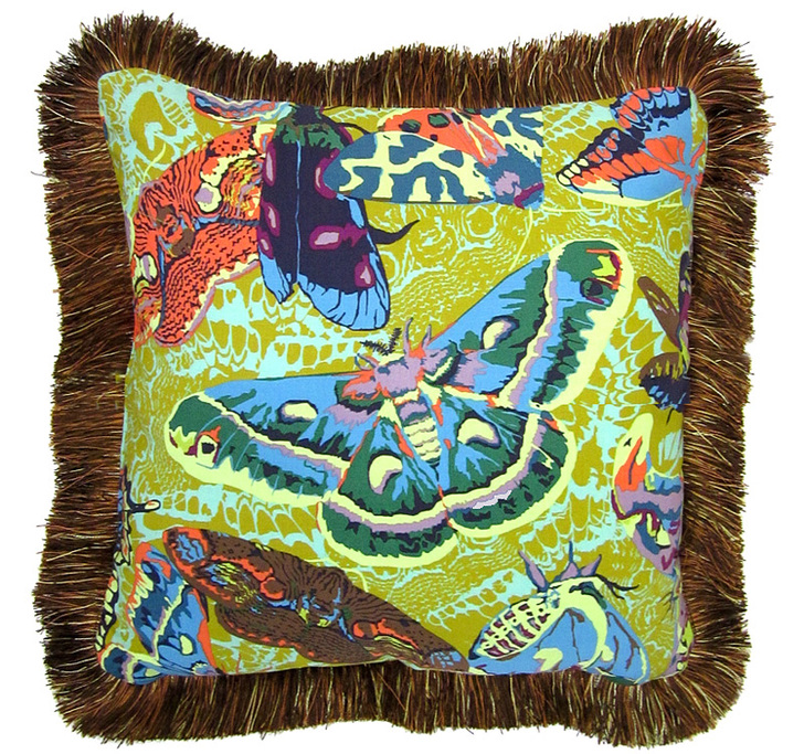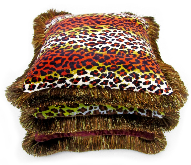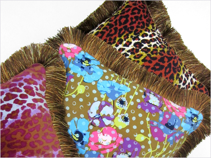 The luxe look of these pillows is accentuated by the gorgeous brush fringe that frames each of them. By using the same fringe on all three pillows, it pulls them together beautifully as a coordinated set. Three reversible pillows yield over a dozen cool combinations. To echo our look, we recommend fabrics with a strong depth of color and motif; they will play off the elegance of the fringe.
