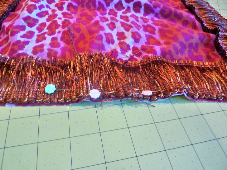 - Starting at the middle of one side (if you have a directional print, start along what will be the bottom of the panel), align the top edge of the fringe with the raw edge of the fabric. Pin in place around all four sides.