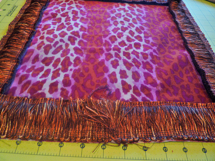 - Trim the fringe to a 67″ length (16¼” x 4 sides + 2″ extra to “futz” with; you’ll trim the excess as needed after all is pinned in place). Wrap the ends of the fringe with a tiny piece of tape to hold the fringe threads in place.