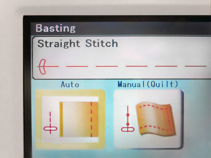 You may own a computerized sewing machine with a pre-programmed basting stitch. These pre-programmed basting stitches can be automatic and/or manual. The automatic setting is a time-saver, simply adjusting the length to the longest setting so you don’t have to manually set the length each time you want to sew a basting stitch. Below is a picture of one our of Janome machines, showing the basting stitch options.