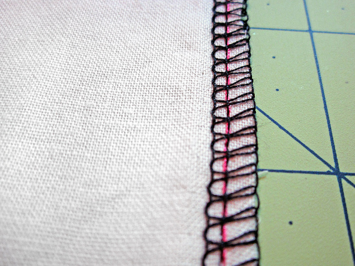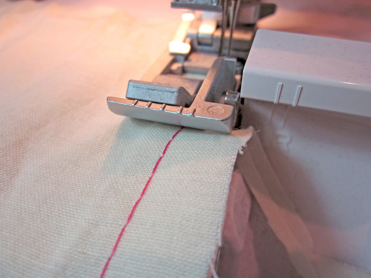 There’s really no need to remove basting stitches (indicated by the pink thread in the picture below) in the serger scenario because you’re unlikely be able to see them through the overlock stitches.