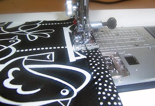 - Edgestitch the binding in place along the upper edge of the pocket. Go slowly and carefully, making sure you are catching both the front and back of the binding in this one seam.
