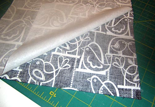 - Apply a 10″ x 15″ piece of fusible web to the wrong side of each 10″ x 15″ rectangle of print fabric (the plain piece – the back, and the piece that now has the pockets attached – the front). Following manufacturer’s instructions, fuse in place.