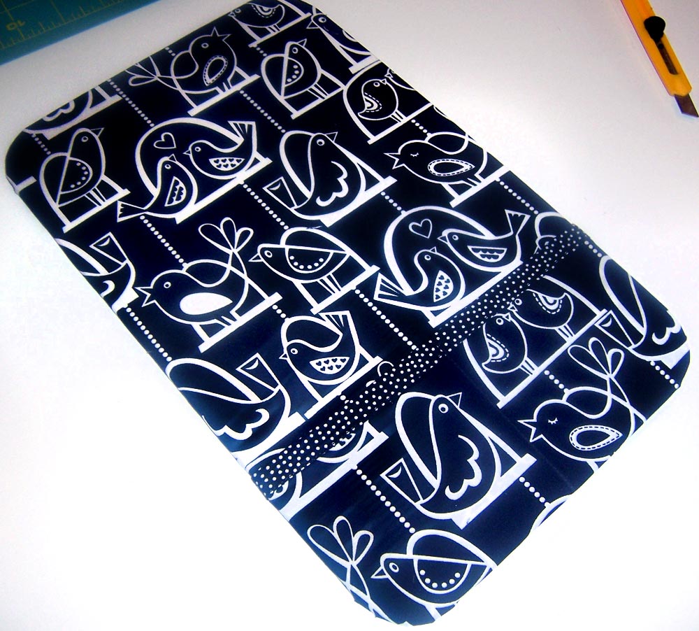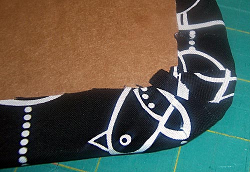 - Wrap the raw edges of the fabric panel around the cardboard and iron in place, clipping the corners of the fabric as needed to easy the fabric and create a smooth edge. Iron again from the front (the covered side) to secure the fabric to the finished side of the cardboard.