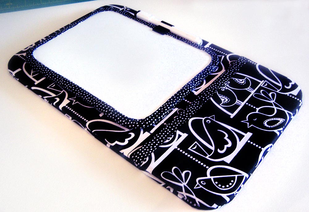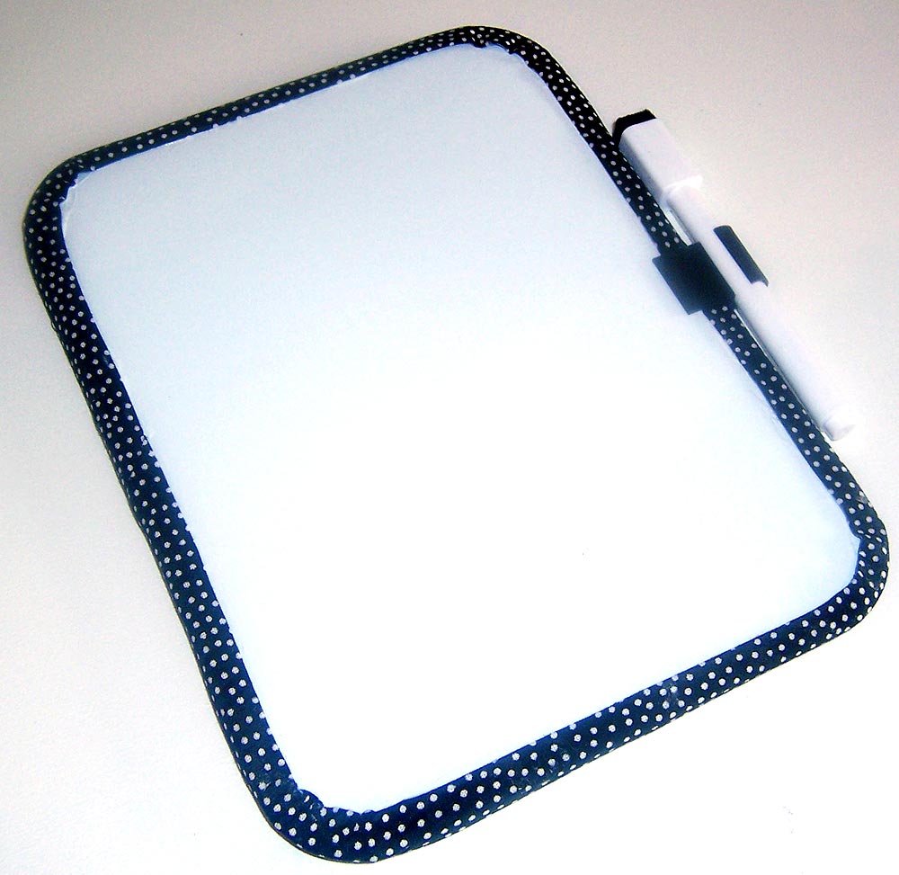 - Run a bead of craft glue along the rim of each side of the board, and wrap the edge with the bias tape trim. Overlap the ends and trim the bias tape at the point where the pen holder was removed so the overlap will be hidden. Use a wet cloth to remove any excess glue from the front of board.