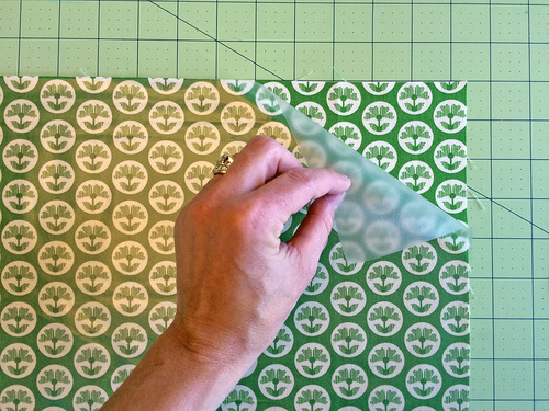 NOTE: As shown in the illustration below, in order to make the best use of our fat quarter of fabric, we cut slightly under a true 45˚ bias cut. It still worked wonderfully to accommodate the curved corners.
