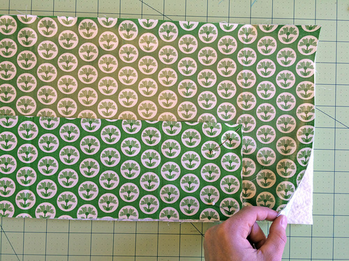 - Assemble the interior layers in the following pattern: place the exterior panel right side down on your work surface, place the batting rectangle on top of the exterior panel, place the interior base panel (with the vinyl in place) right side up on the batting layer, then place the folded pocket piece on the very top, aligning the pocket’s left raw edge and bottom raw edge with the base panel; the other layers will extend beyond the pocket by about 3¼”. Pin all the layers in place.