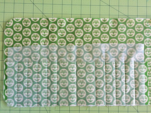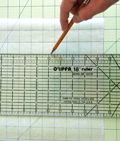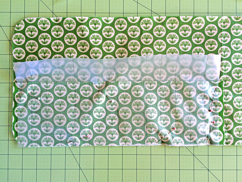 - Pin the marked wax paper securely over the top of the pocket panel. The paper should be centered side to side, which means there will be ¼” of fabric extending beyond the paper on each side.