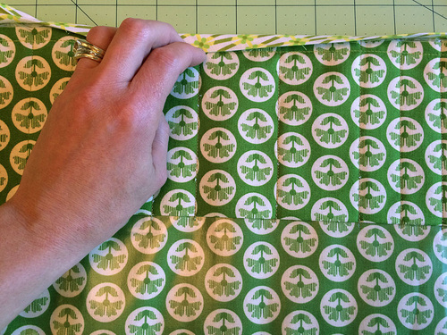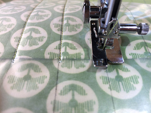 - To sew the pocket divisions, you can use matching or contrasting thread. We chose matching. We used a Ditch Quilting foot with the needle moved slightly to the left for a super precise line.